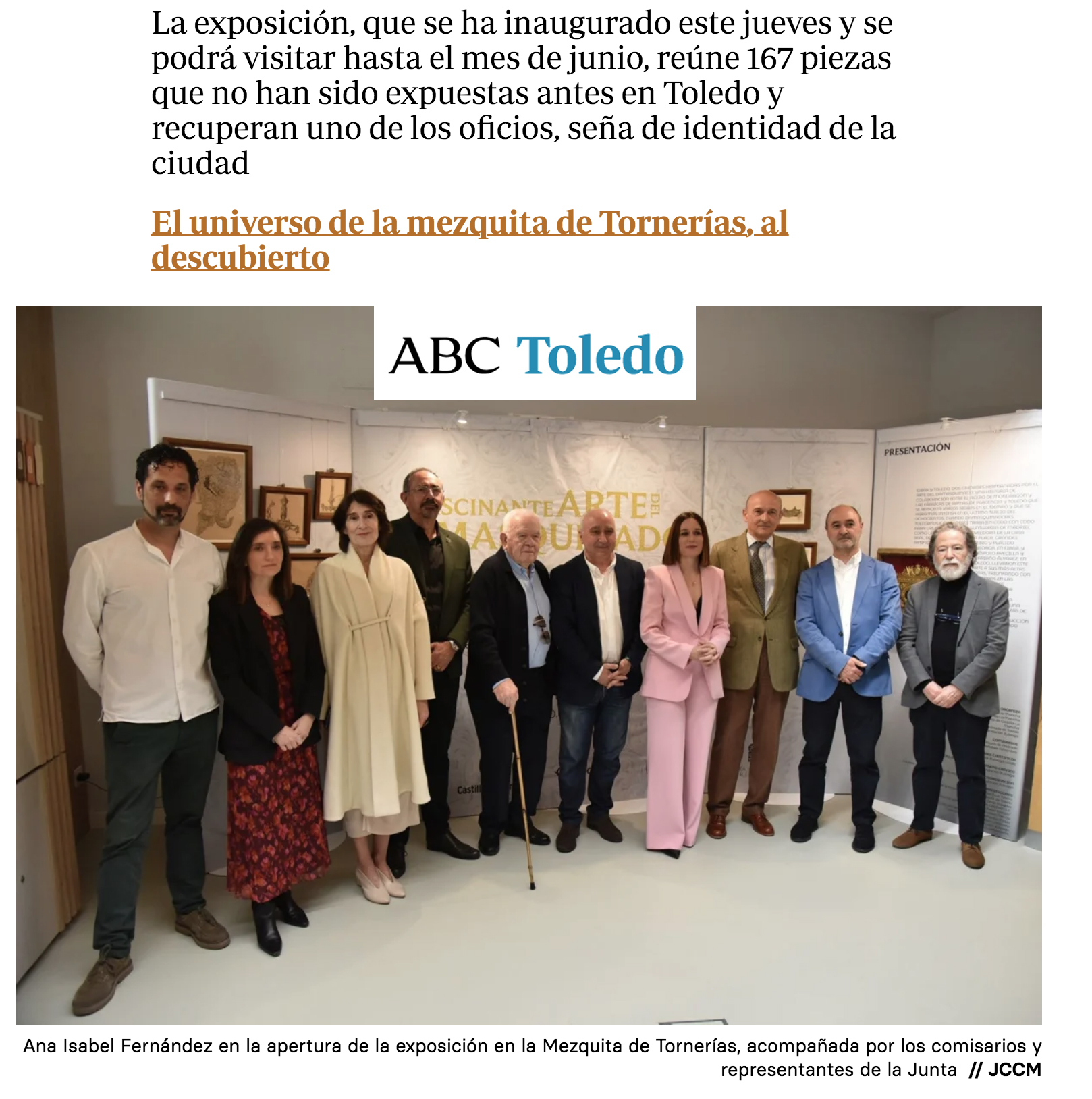 Este jueves 10 de abril se inaugura en la mezquita de Tornerías una exposición única, en la que el visitante podrá admirar una selección de obras primorosamente damasquinadas. PARA LEER EL ARTICULO COMPLETO EN "ABC TOLEDO" PINCHA AQUI