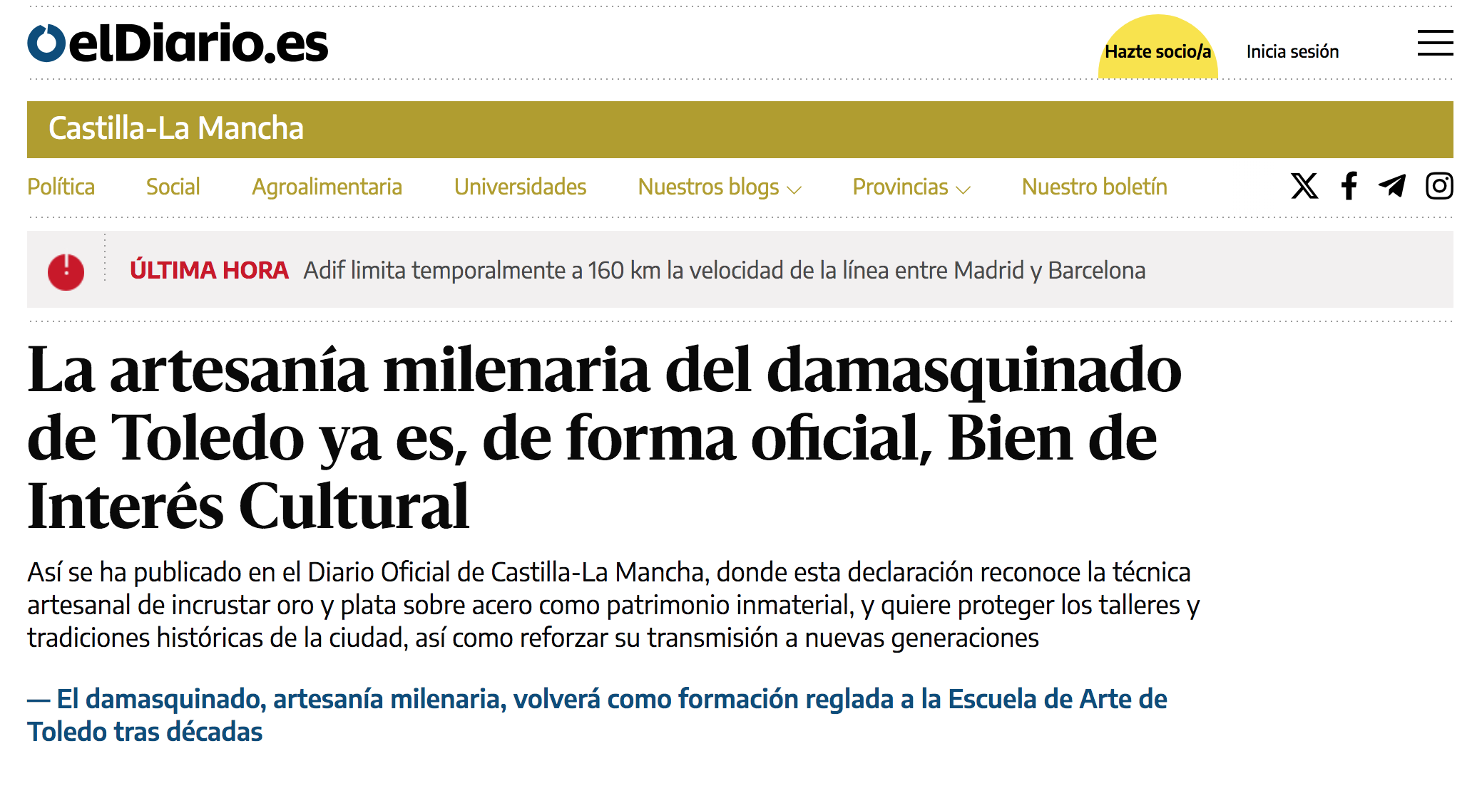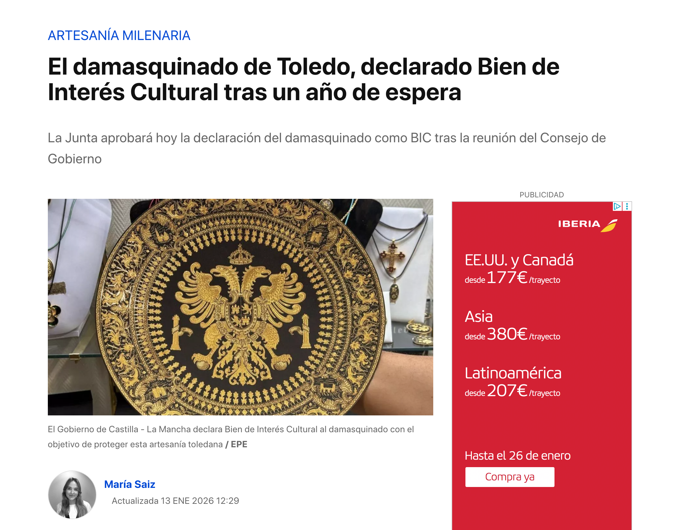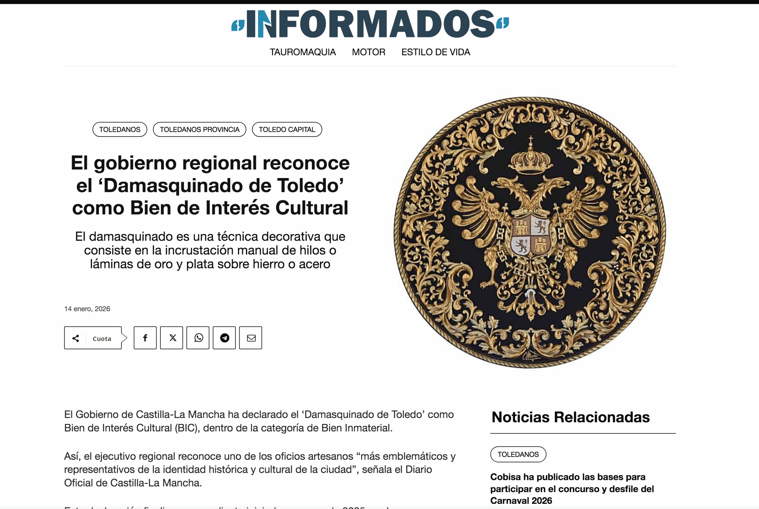 Así se ha publicado en el Diario Oficial de Castilla-La Mancha, donde esta declaración reconoce la técnica artesanal de incrustar oro y plata sobre acero como patrimonio inmaterial, y quiere proteger los talleres y tradiciones históricas de la ciudad, así como reforzar su transmisión a nuevas generaciones. PARA LEER EL ARTÍCULO COMPLETO PINCHA AQUI