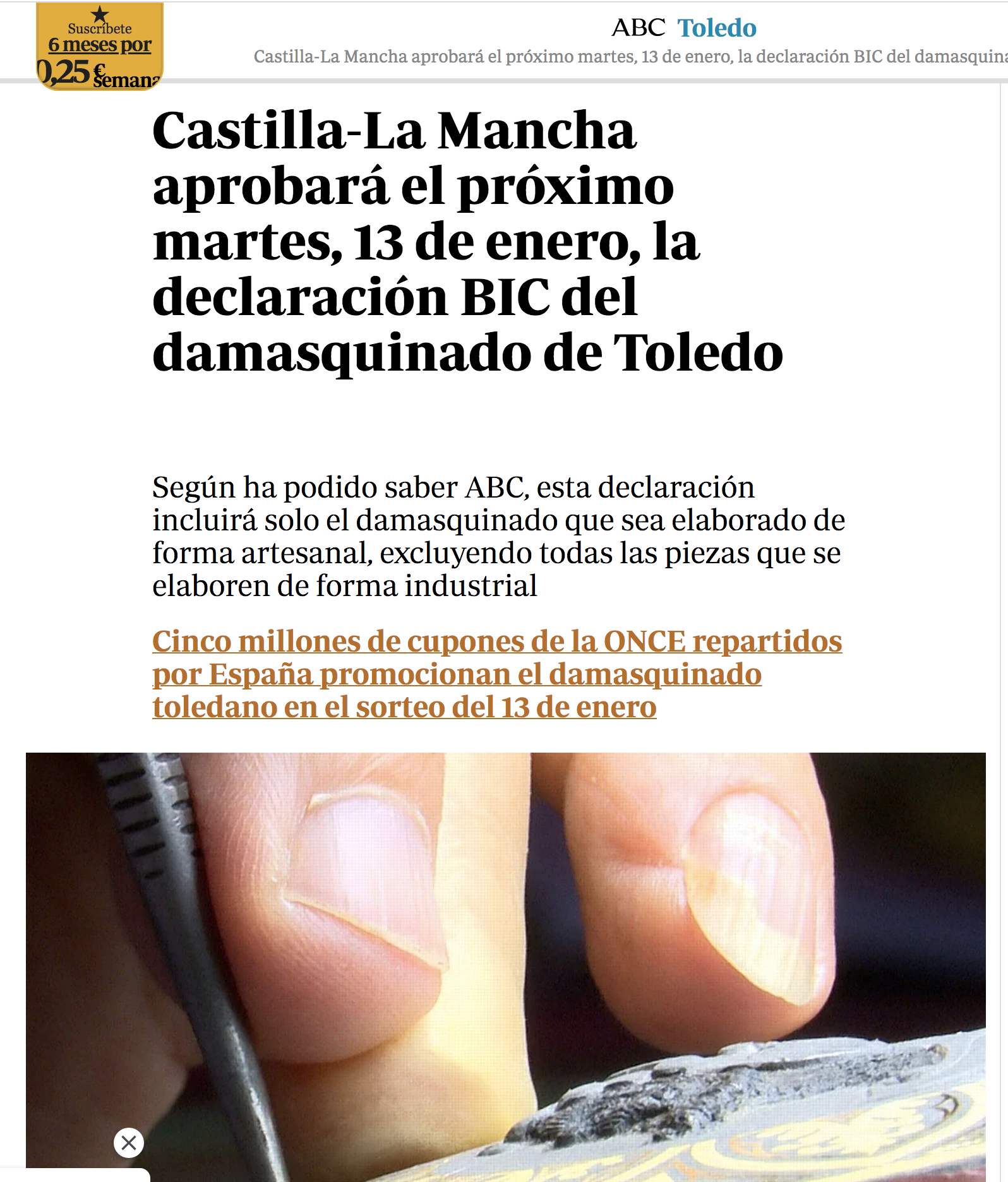 La Junta aprobará hoy la declaración del damasquinado como BIC tras la reunión del Consejo de Gobierno. Tras un año de iniciar su tramitación, y mucho por parte de la Fundación Damasquinado de Toledo, está previsto que el Gobierno de Castilla-La Mancha de un importante paso en la protección de esta artesanía toledana, convirtiéndola en Bien de Interés Cultural. PARA LEER EL ARTÌCULO COMPLETO PINCHA AQUI