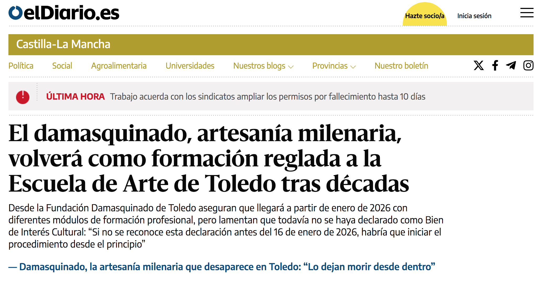 Desde la Fundación Damasquinado de Toledo aseguran que llegará a partir de enero de 2026 con diferentes módulos de formación profesional, pero lamentan que todavía no se haya declarado como Bien de Interés Cultural: “Si no se reconoce esta declaración antes del 16 de enero de 2026, habría que iniciar el procedimiento desde el principio”,