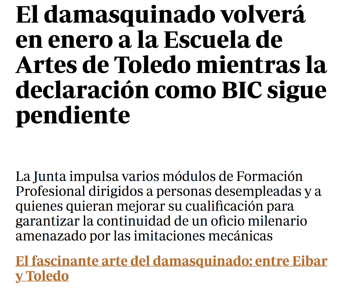 El damasquinado volverá en enero a la Escuela de Artes de Toledo mientras la declaración como BIC sigue pendiente